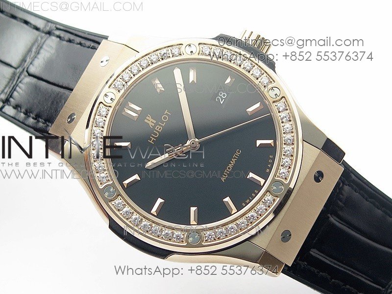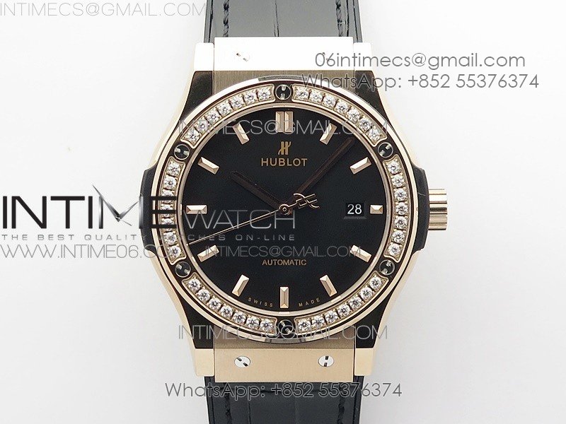Classic Fusion 42mm RG Paved Diamonds Bezel B50F Black Dial On Black Gummy Strap A2892