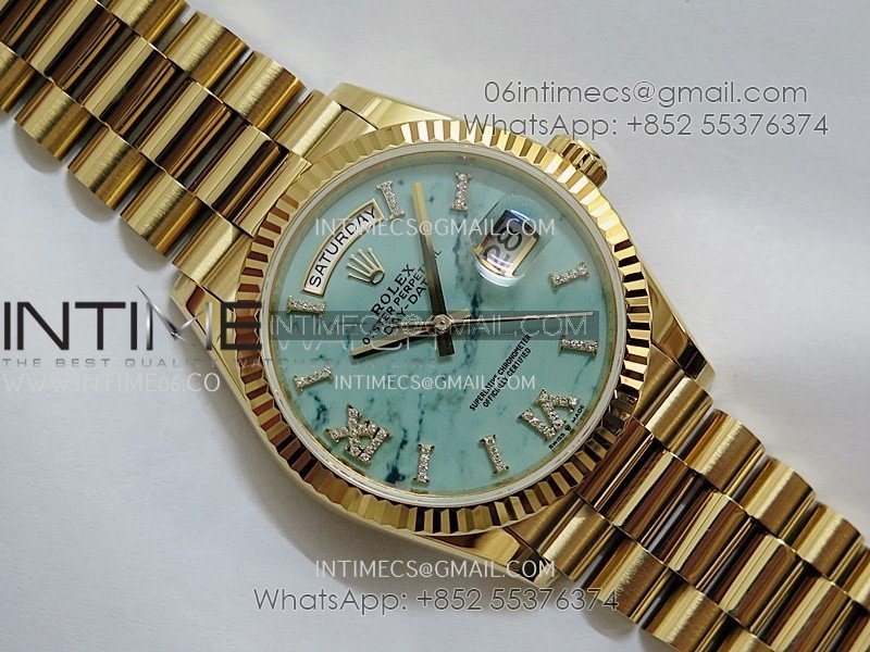 Day Date 128238 36mm YG KF 1:1 Best Edition Turquoise Dial Diamond Marker On President Bracelet A2836 (Gain Weight)