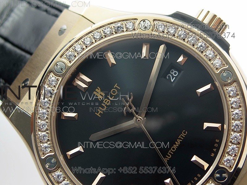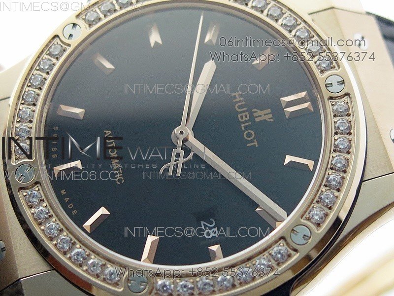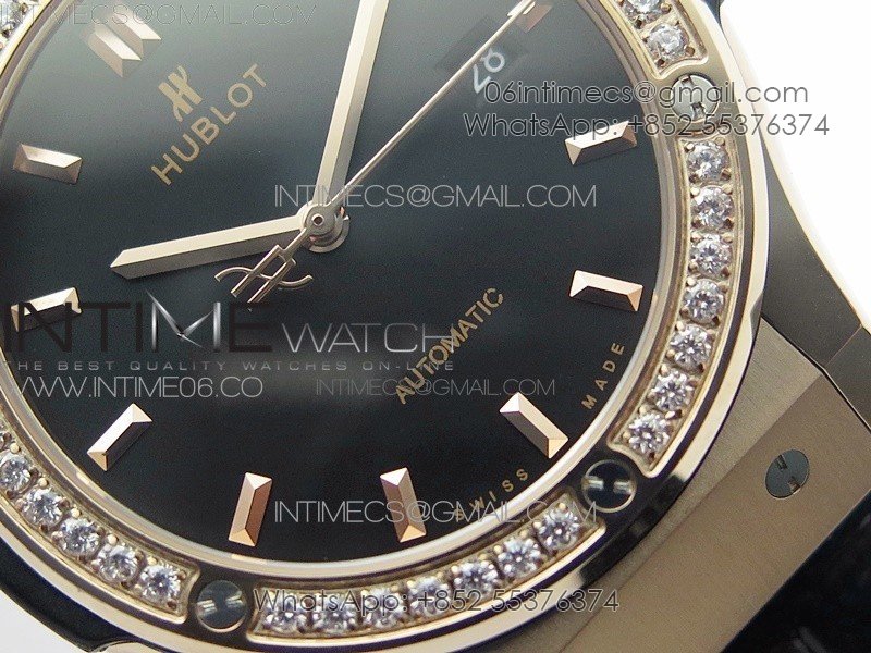 Classic Fusion 42mm RG Paved Diamonds Bezel B50F Black Dial On Black Gummy Strap A2892