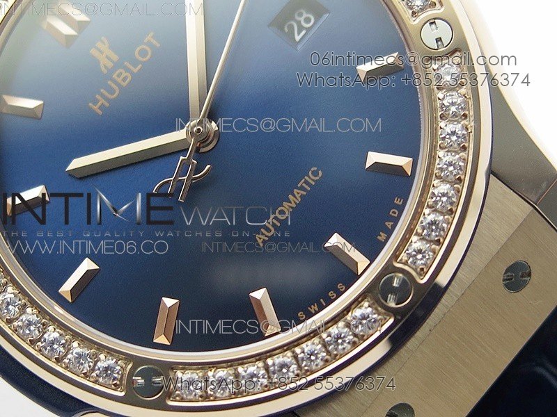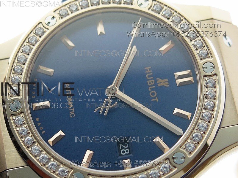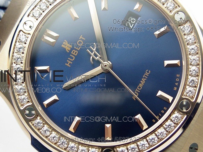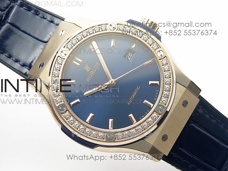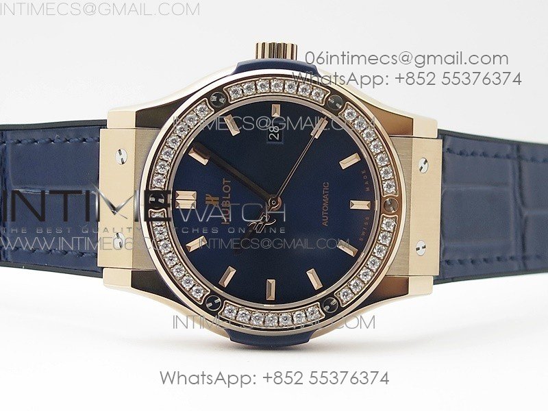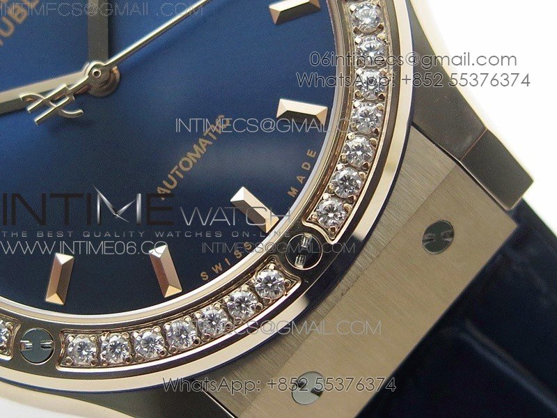 Classic Fusion 42mm RG Paved Diamonds Bezel B50F Blue Dial On Blue Gummy Strap A2892