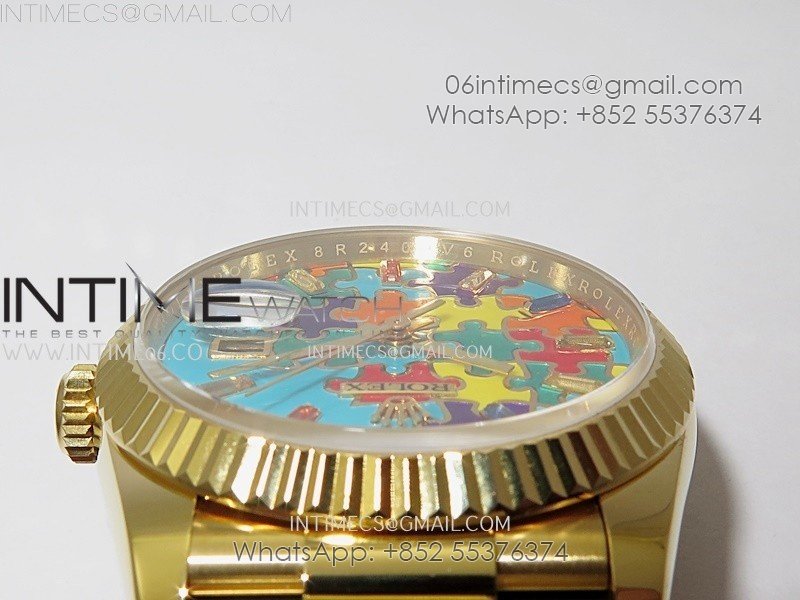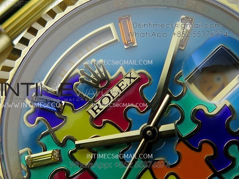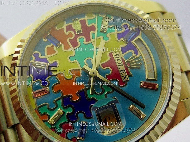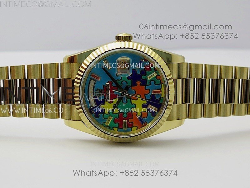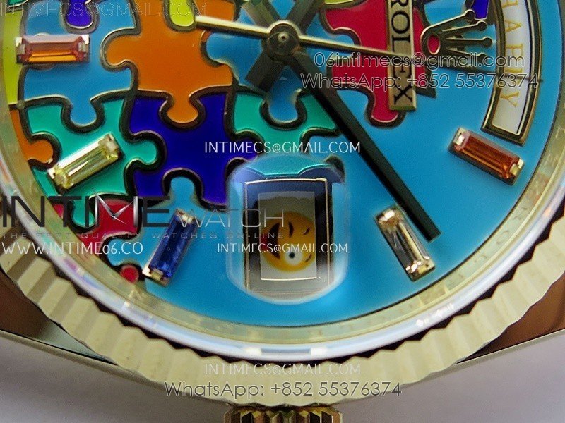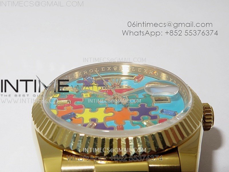 Daydate 128238 36mm Colour Jigsaw Puzzle YG QHF Best Edition Turquoise Blue Dial on YG President Bracelet A2834