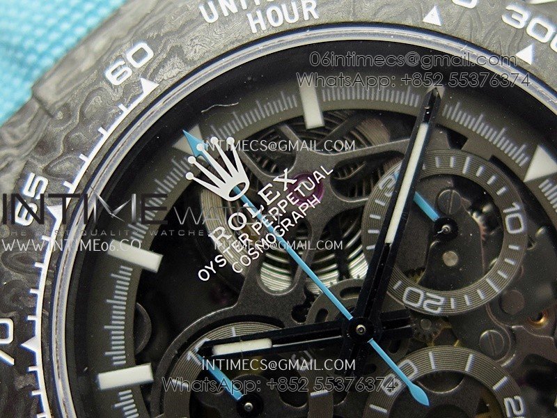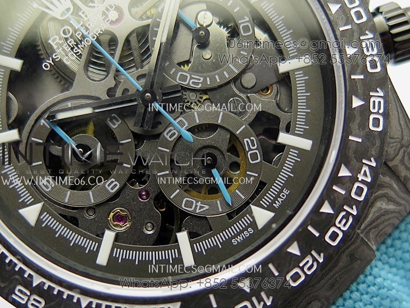 Movement Custom made skeleton Asian Super Clone4130 movement 28800vph, 1:1 replicated from the genuine movement, fully functional. Blue spring same as genuine.