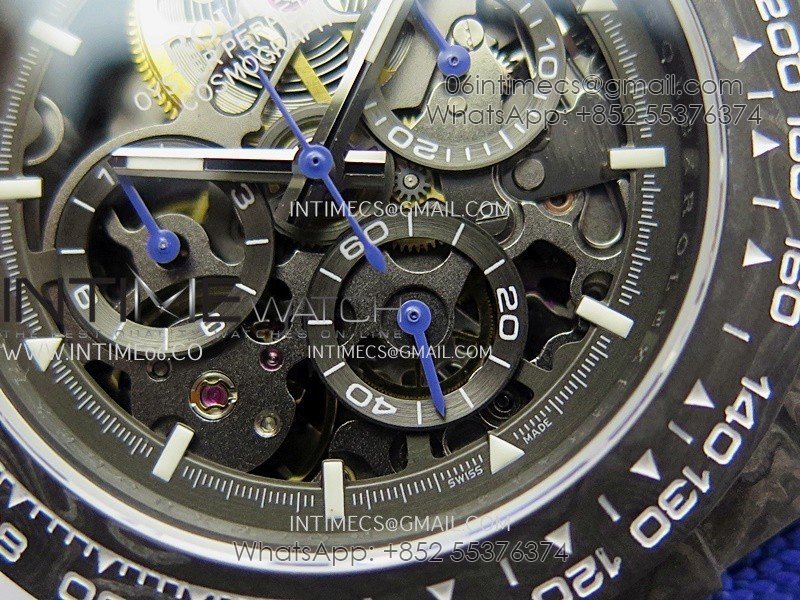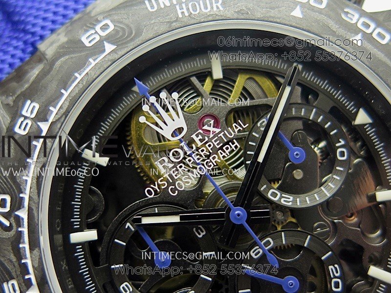 Movement Custom made skeleton Asian Super Clone4130 movement 28800vph, 1:1 replicated from the genuine movement, fully functional. Blue spring same as genuine.