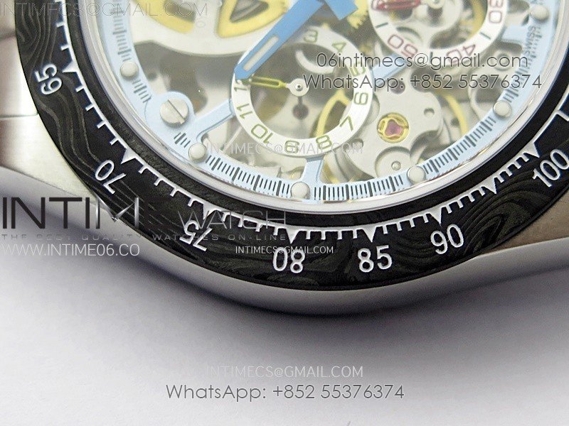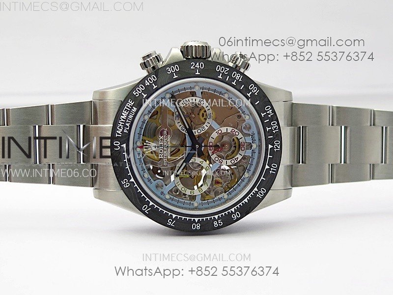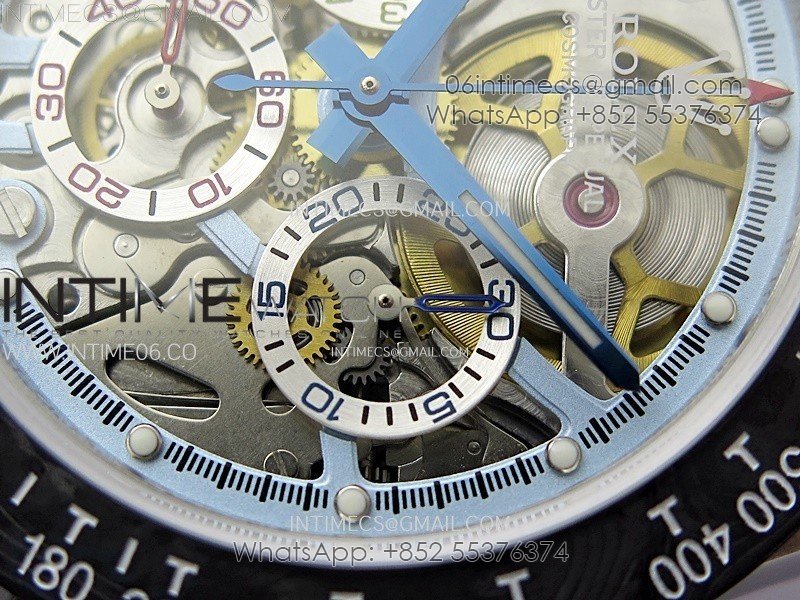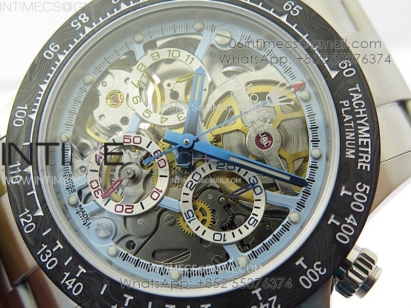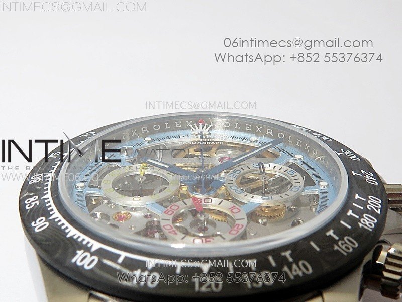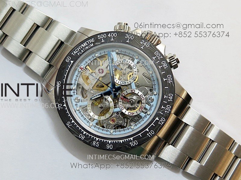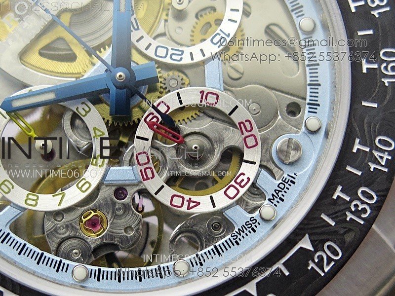 Movement Custom made skeleton asian Super Clone4130 movement 28800vph, 1:1 replicated from the genuine movement, fully functional. Blue spring same as genuiine.