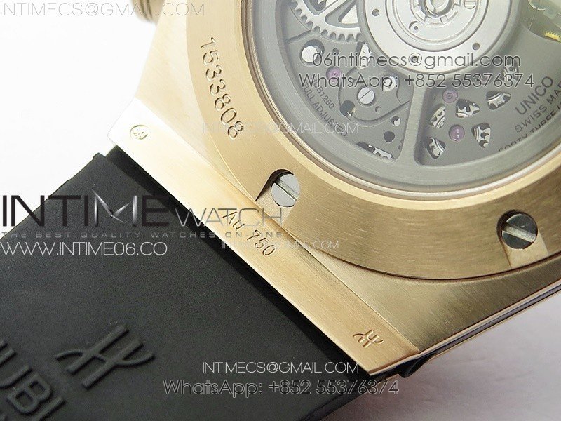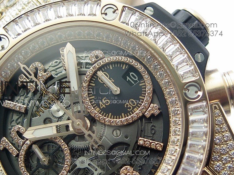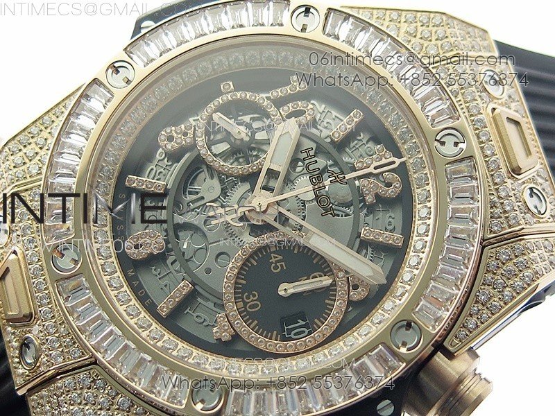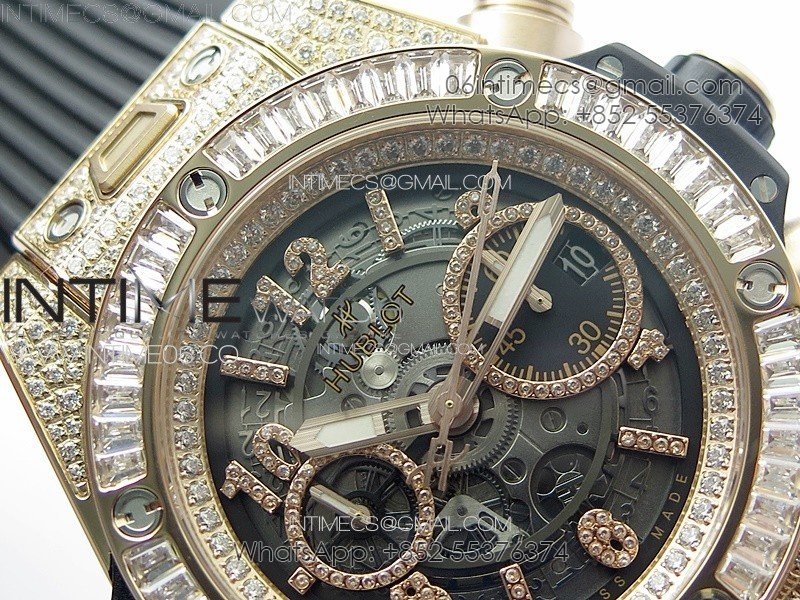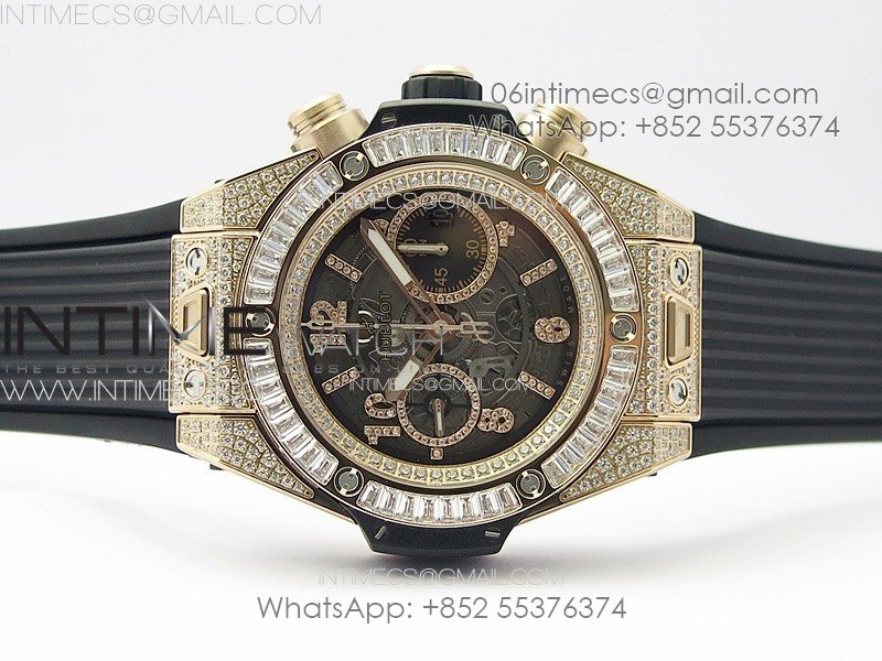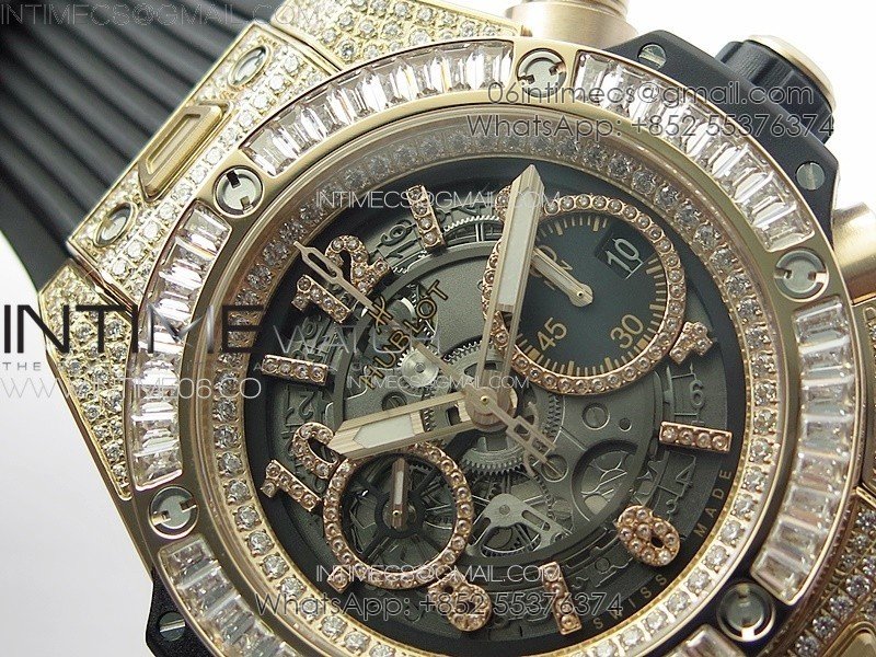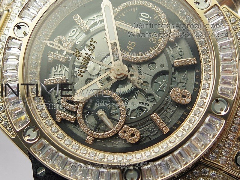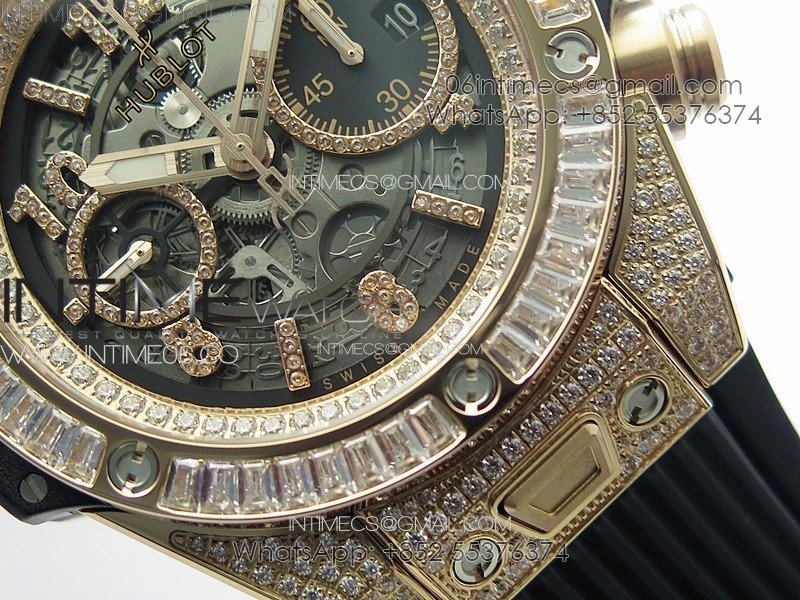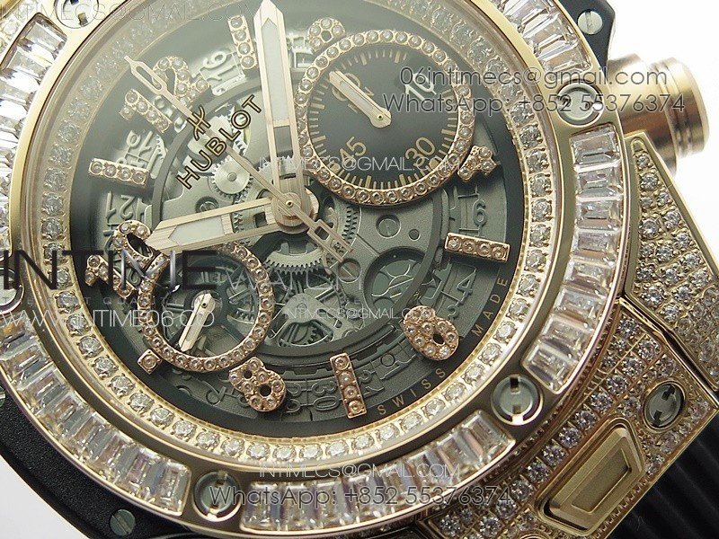 Hublot Big Bang Unico RG Full Diamonds ZF 1:1 Best Edition Skeleton Dial T Diamonds Bezel on Black Rubber Strap A1280