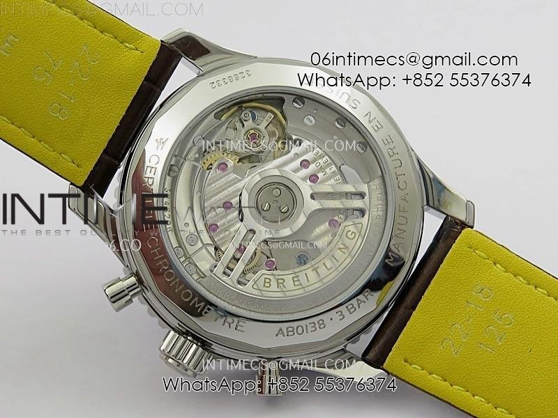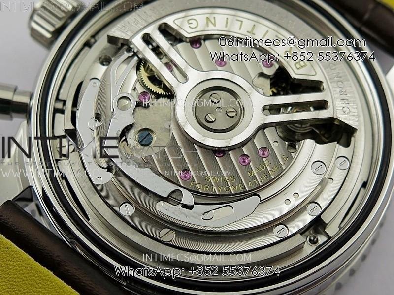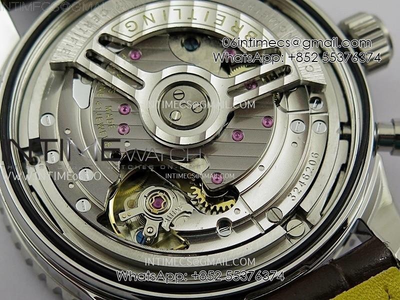 Movement: Base Movement: Asian 7750 automatic chronograph movement at 28800vph; Decoration: Platinum plated movement plate and rotor which are made according to the genuine movement, the best looking Breitling Calibre Movement Clone at the moment.