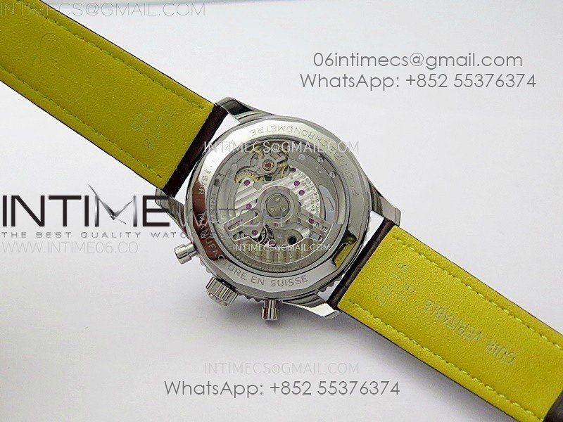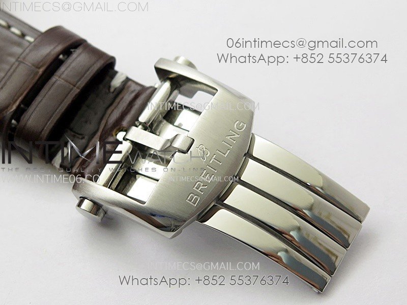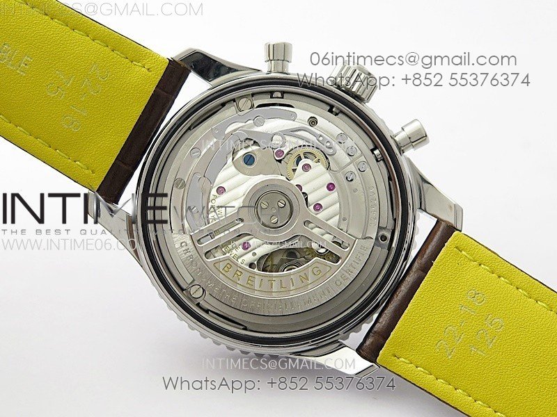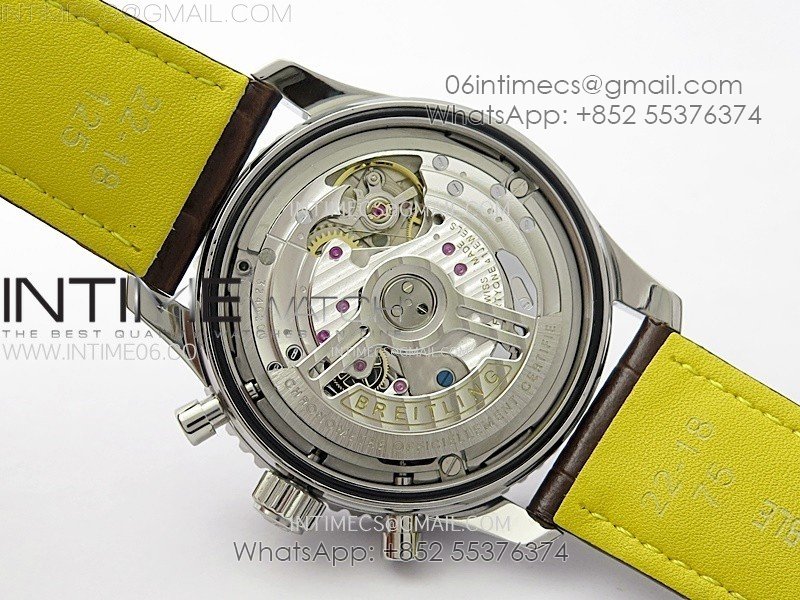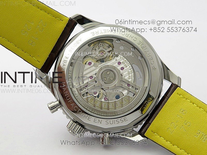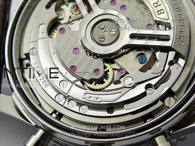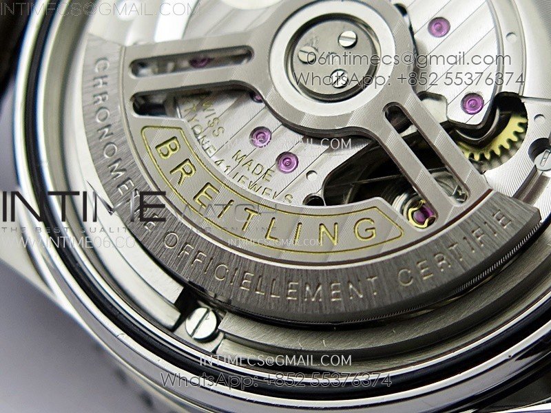 Movement: Base Movement: Asian 7750 automatic chronograph movement at 28800vph; Decoration: Platinum plated movement plate and rotor which are made according to the genuine movement, the best looking Breitling Calibre Movement Clone at the moment.