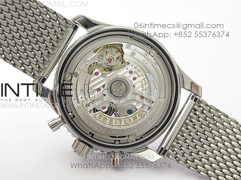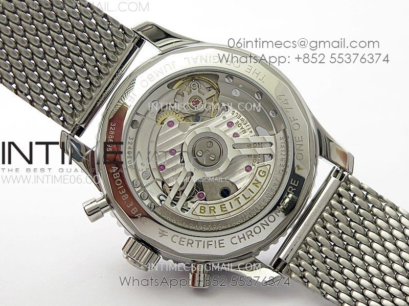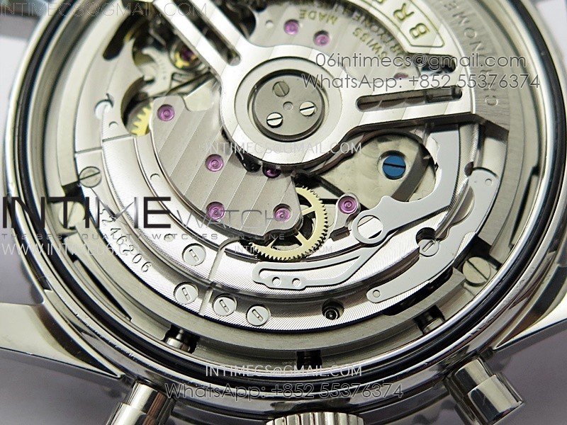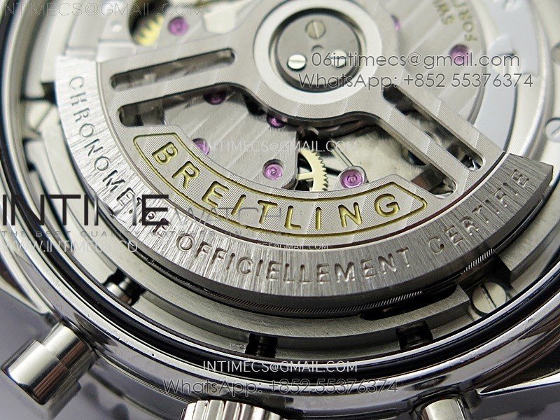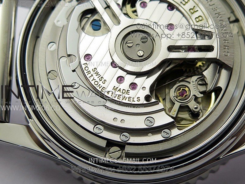 Movement:    Base Movement: Asian 7750 automatic chronograph movement at 28800vph; Decoration: Platinum plated movement plate and rotor which are made according to the genuine movement, the best looking Breitling Calibre Movement Clone at the moment.