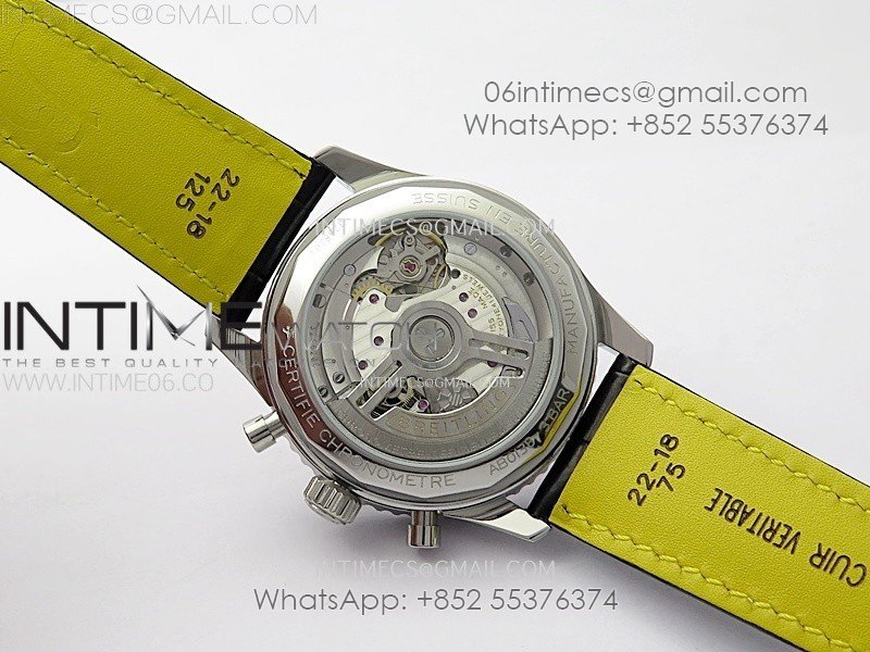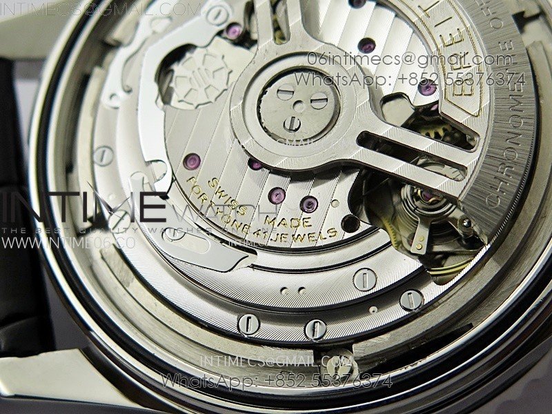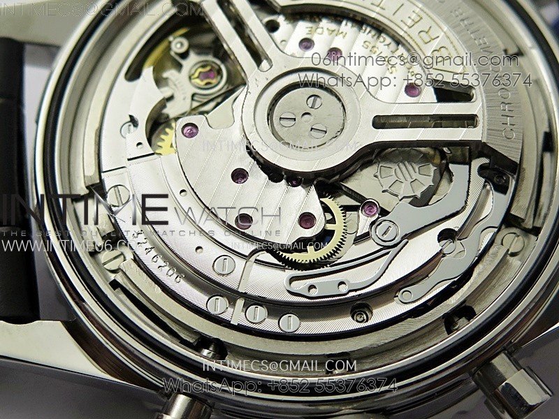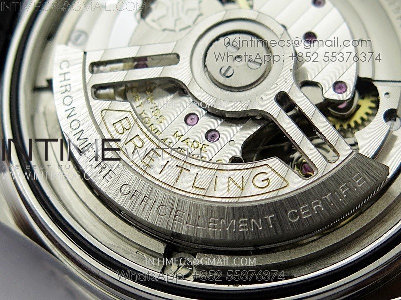 Movement: Base Movement: Asian 7750 automatic chronograph movement at 28800vph; Decoration: Platinum plated movement plate and rotor which are made according to the genuine movement, the best looking Breitling Calibre Movement Clone at the moment.