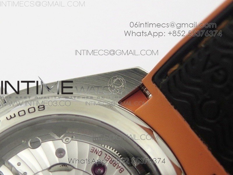 Bezel   Uni-directional rotating liquidmetal bezel with orange rubber