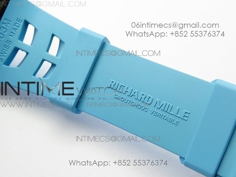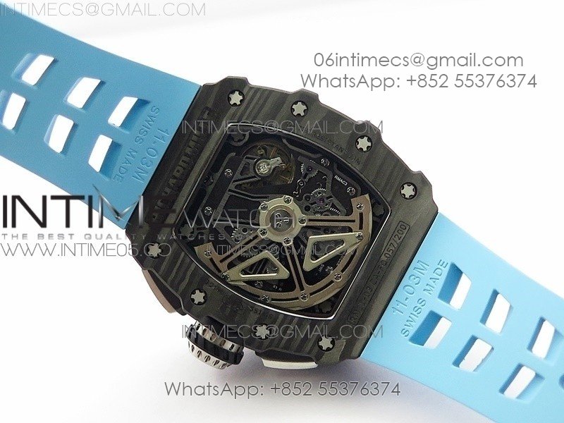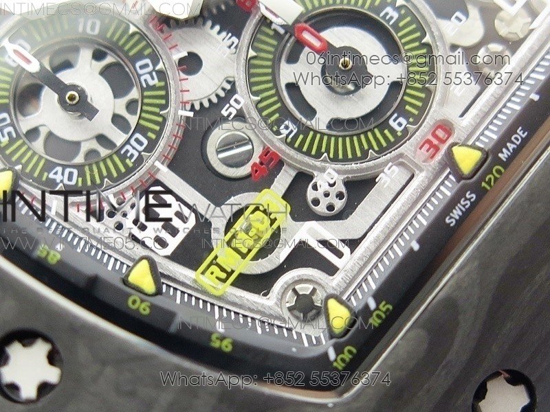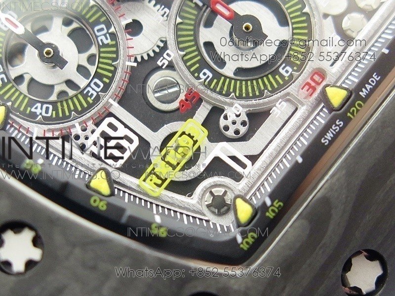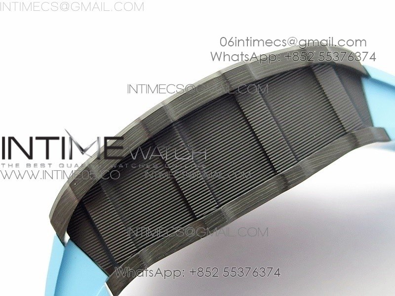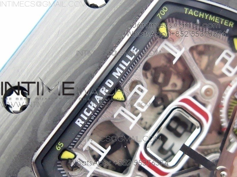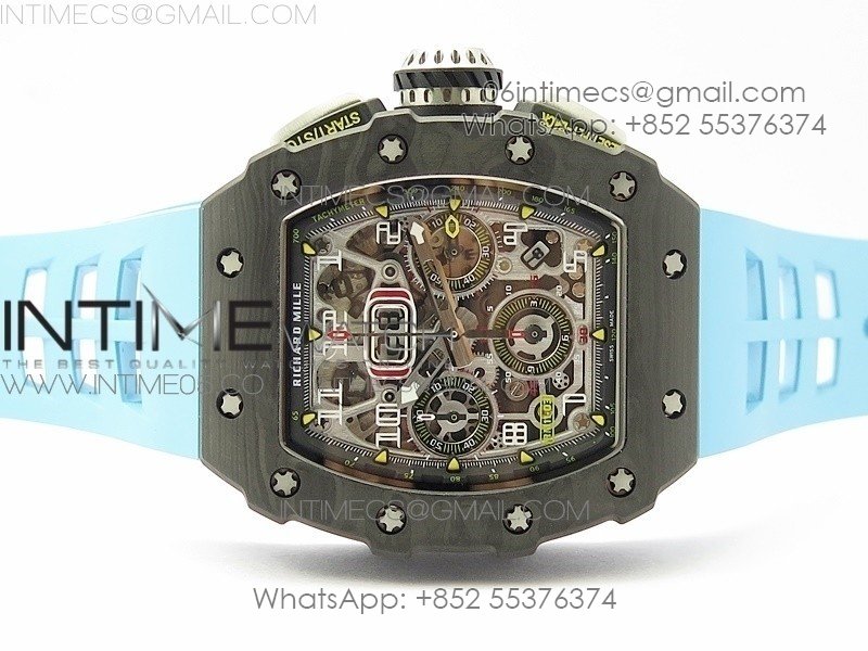 RM011 Carbon Case Chrono KVF 1:1 Best Edition Crystal Skeleton Yellow Dial on Blue Rubber Strap A7750 V2