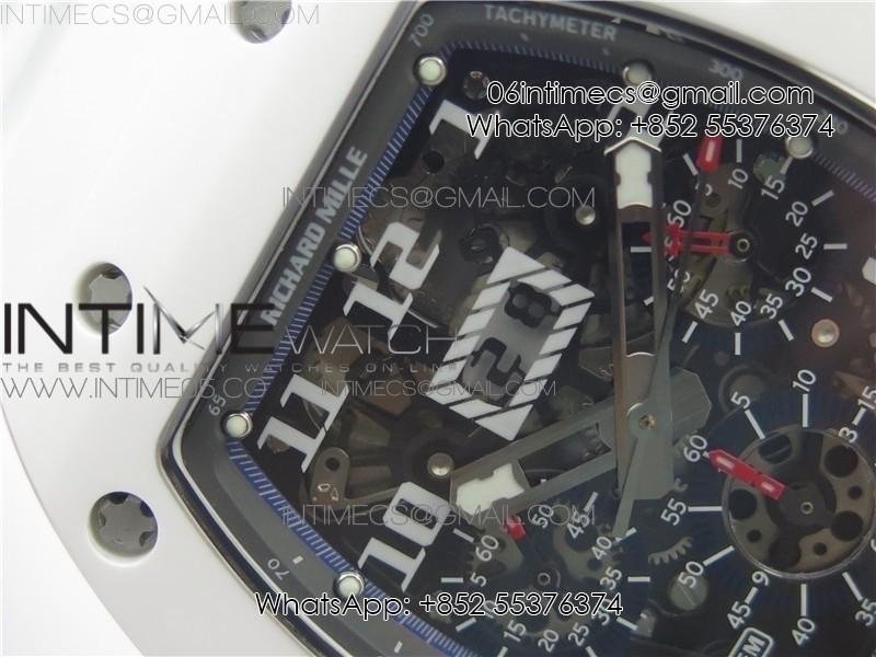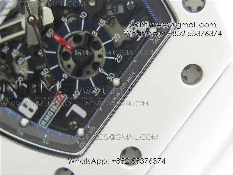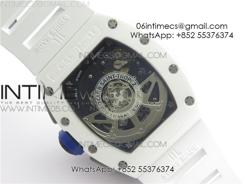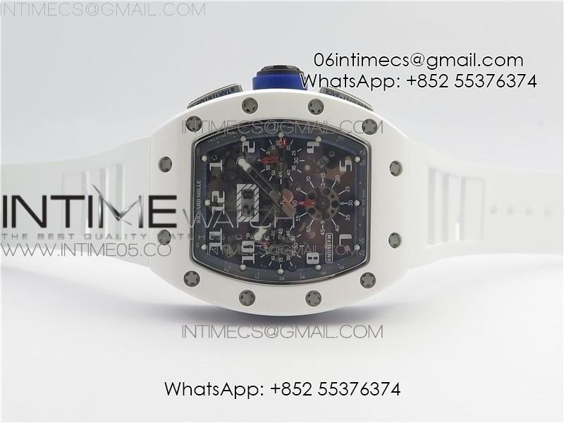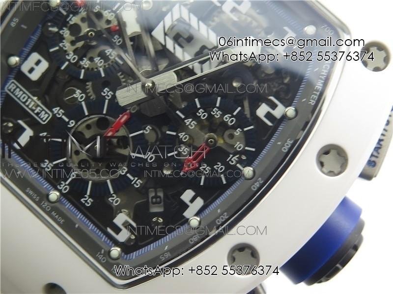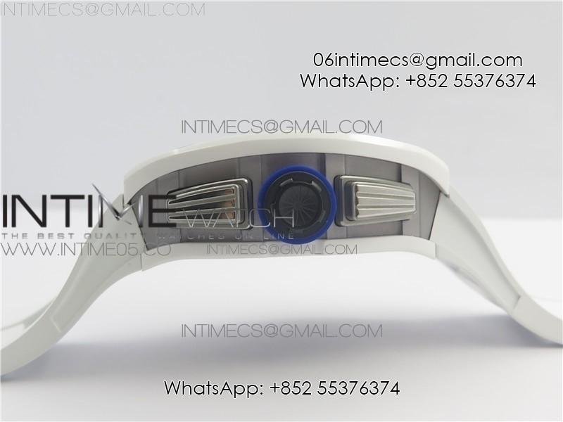 RM011 Real White Ceramic Chronograph KVF 1:1 Best Edition Crystal Skeleton Dial Blue on White Rubber Strap A7750