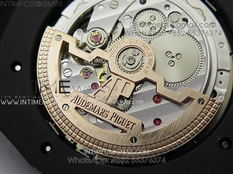 Movement Base Movement: Asian 23J Automatic Movement at 21600vph Decoration: Platinum plated movement plate and rotor which is made according to the genuine movement, the best looking AP Calibre Movement