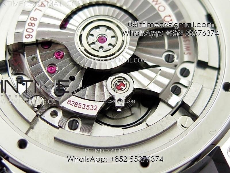 Movement Asian 2824 automatic movement decorated to Omega 8806 movement, black balance wheel, Same black balance wheel with four axis wave shape as genuine.
